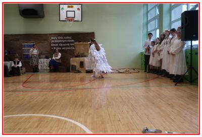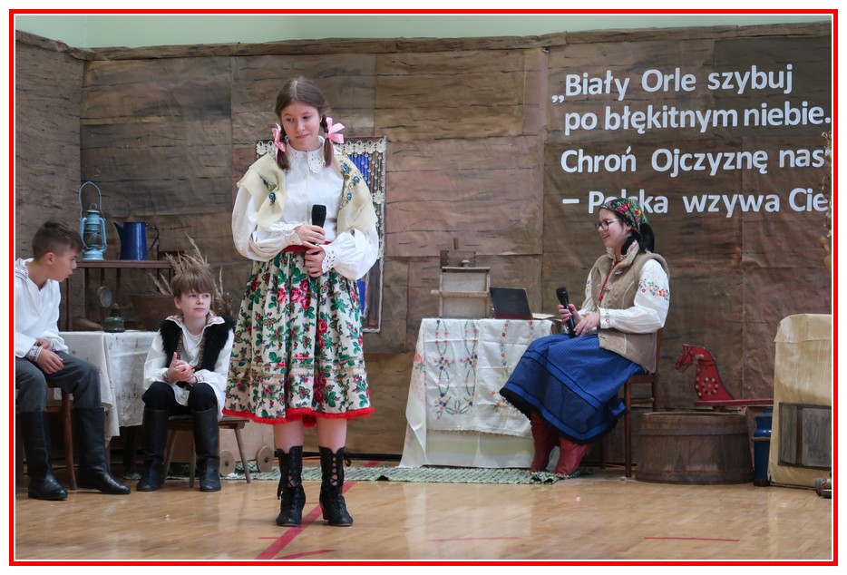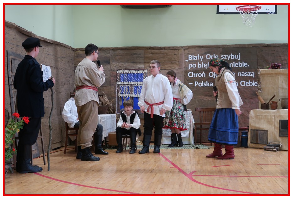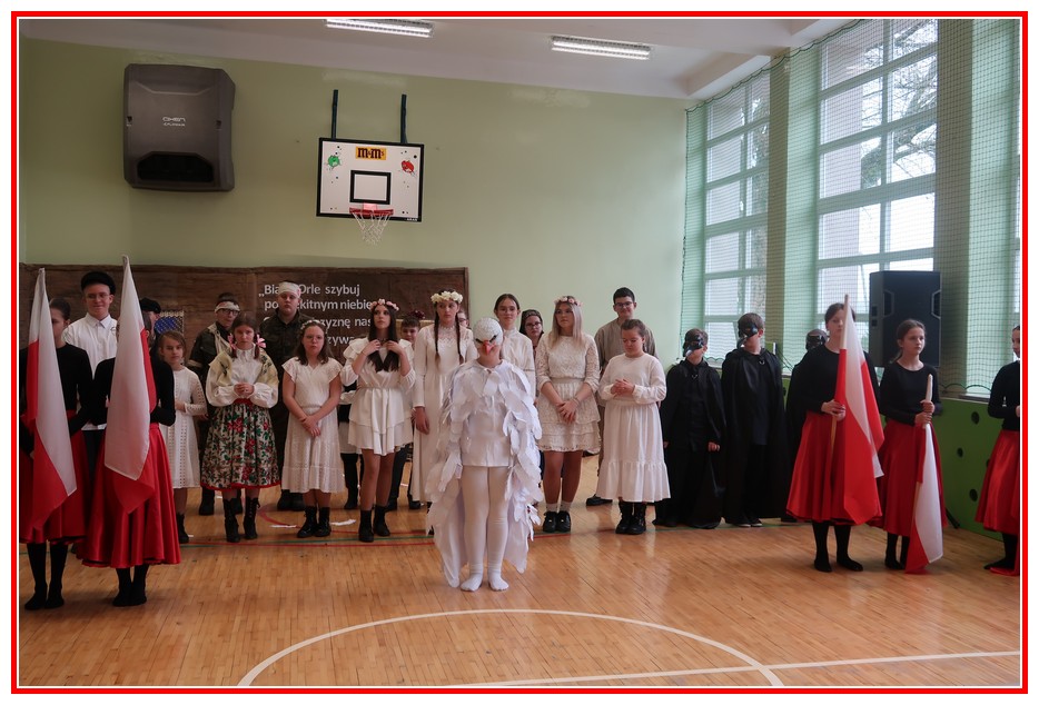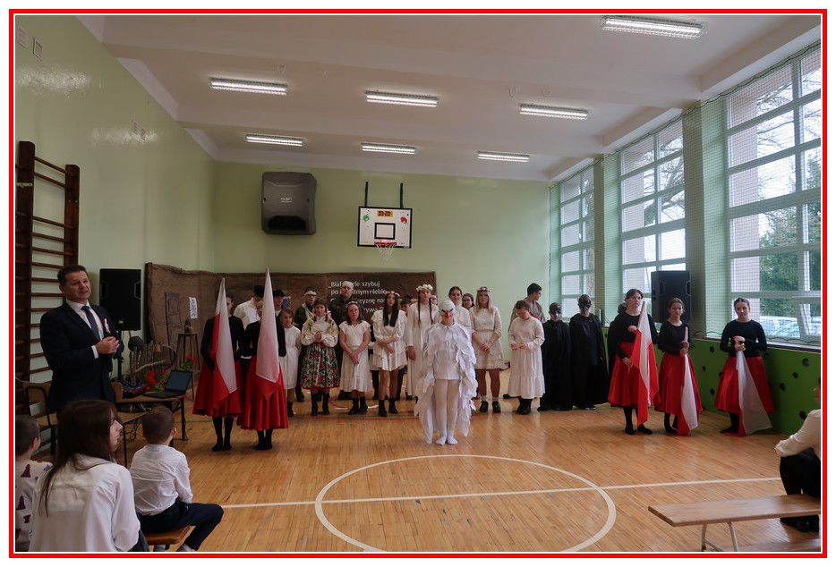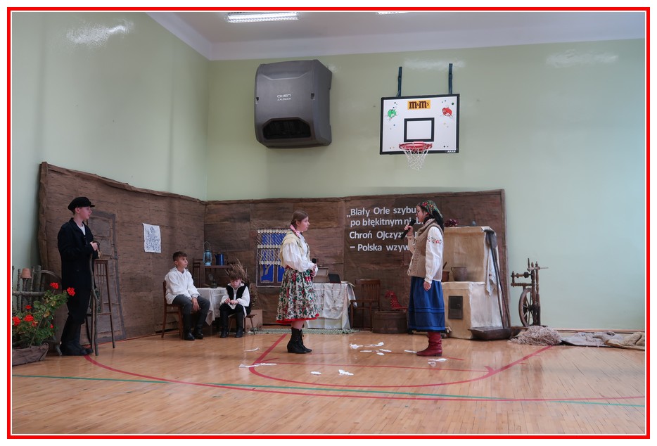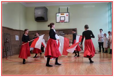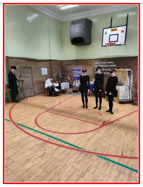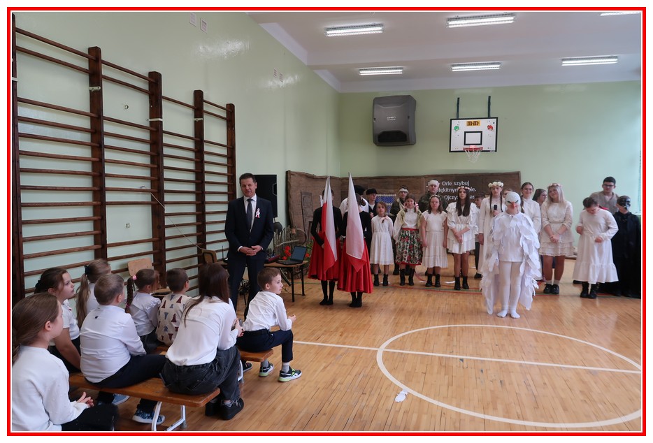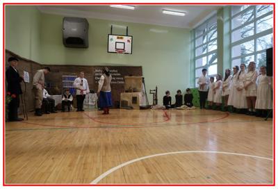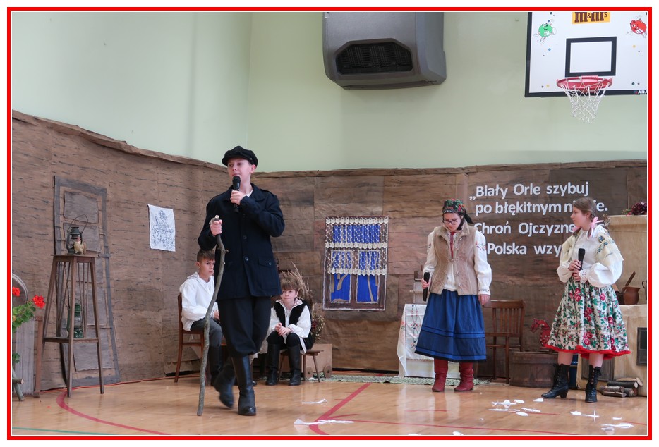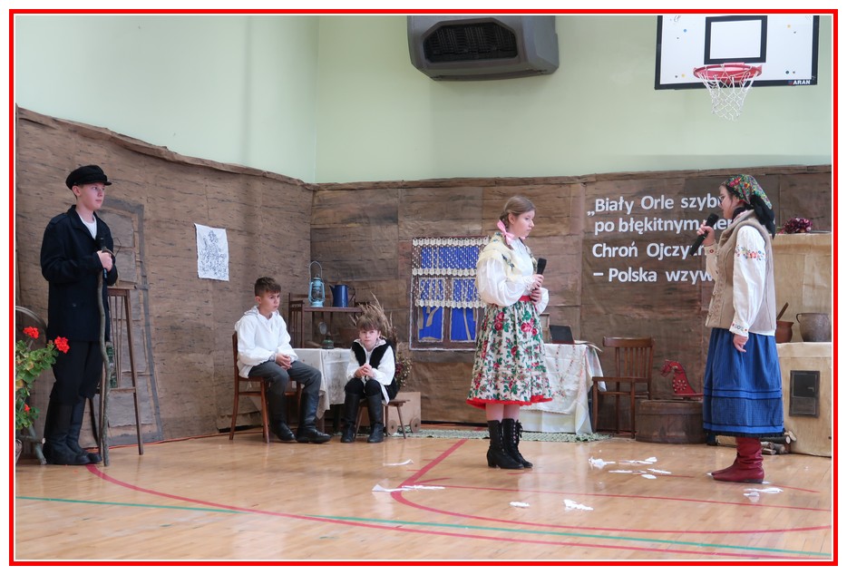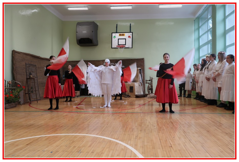 Z okazji rocznicy odzyskania Niepodległości przez Polskę, uczniowie zaprezentowali spektakl teatralny pt.”Pisk białego Orła”. Fabuła przedstawienia osnuta została wokół losów wiejskiej rodziny, która w czasie I wojny światowej przeżyła wojenną traumę – wymarsz ojca i jednego z synów na front. Ludzie ci ukrywali w swoim domu poetę, który odwołując się do literatury i poezji okresu zaborów, podtrzymywał i umacniał głęboki patriotyzm domowników. W wielu sytuacjach odwoływał się do tragicznej historii naszego państwa. Symbolem wolnej Polski staje się biały orzeł, którego pisk, słyszalny w duszy Polaków, nie pozwalał tracić nadziei na wolność. Jednak oprócz prawdziwych patriotów byli i tacy, którym było obojętne, czy Polska jest wolna, czy nie, „byle był spokój i miska pełna”. Taką postawę reprezentowały koty. Spektakl został urozmaicony pantomimą ukazującą Legendę o Białym Orle. Była to w nietypowy sposób opowiedziana historia utraty i odzyskania niepodległości przez naszą Ojczyznę. Sam moment zmartwychwstania Polski został przedstawiony w formie układu tanecznego z flagami. Przedstawienie odbywało się przy nastrojowych, dobranych do tematyki patriotycznej piosenkach, wykonanych przez szkolny zespół wokalny. Myślą przewodnią całości były słowa z pieśni Szybuj Orle: „Biały Orle szybuj po błękitnym niebie . Chroń Ojczyznę naszą- Polska wzywa Ciebie”