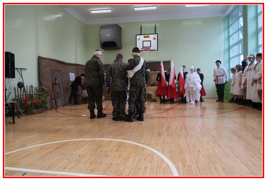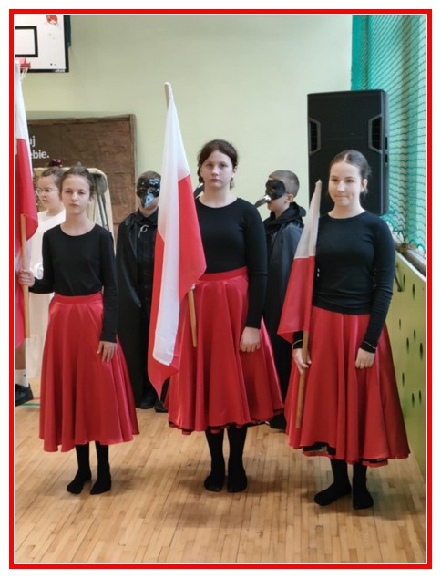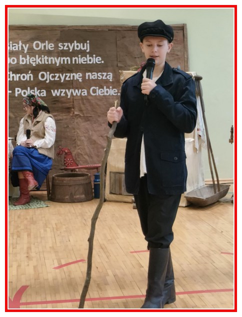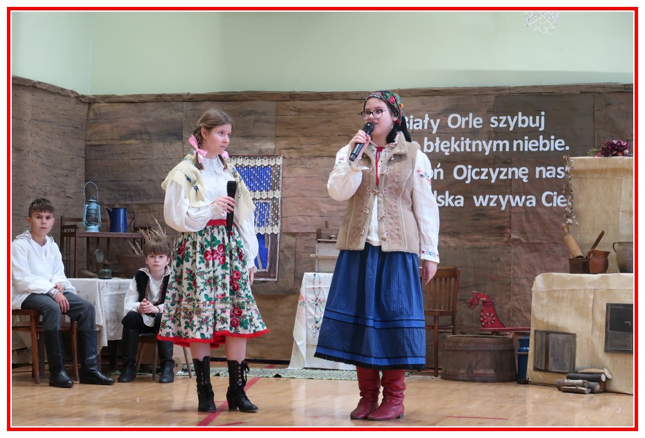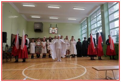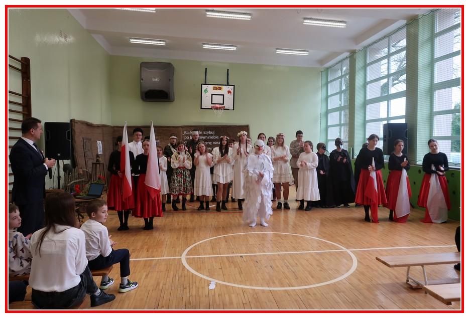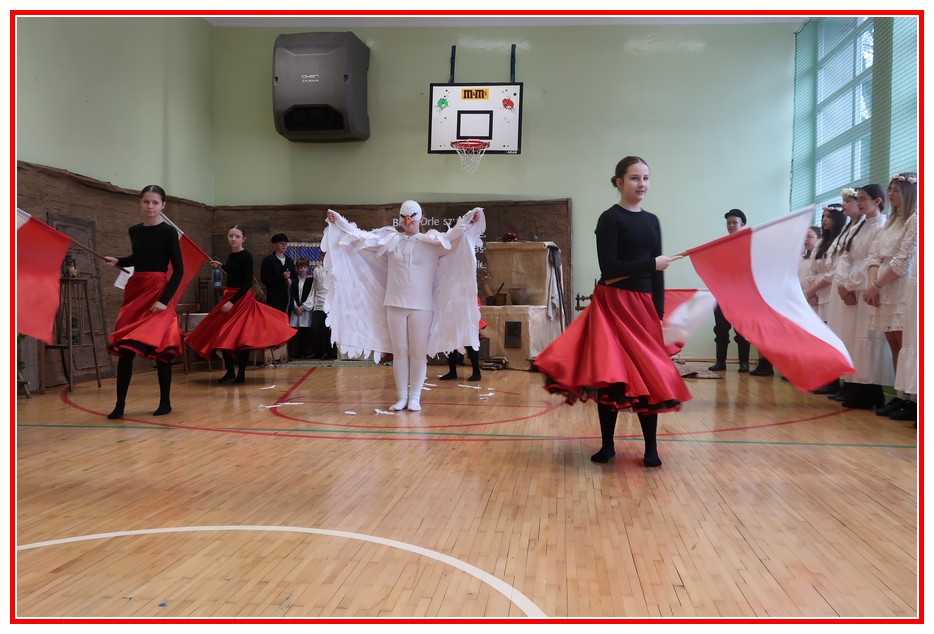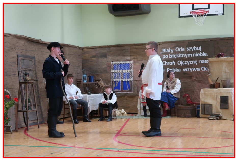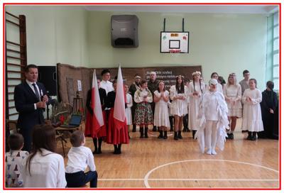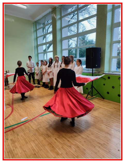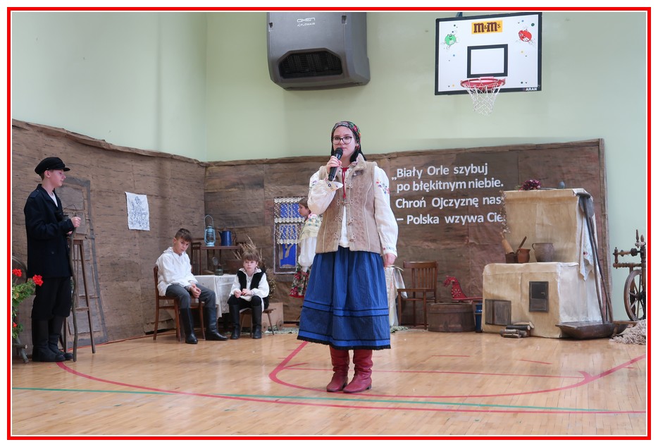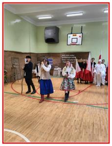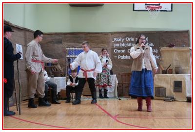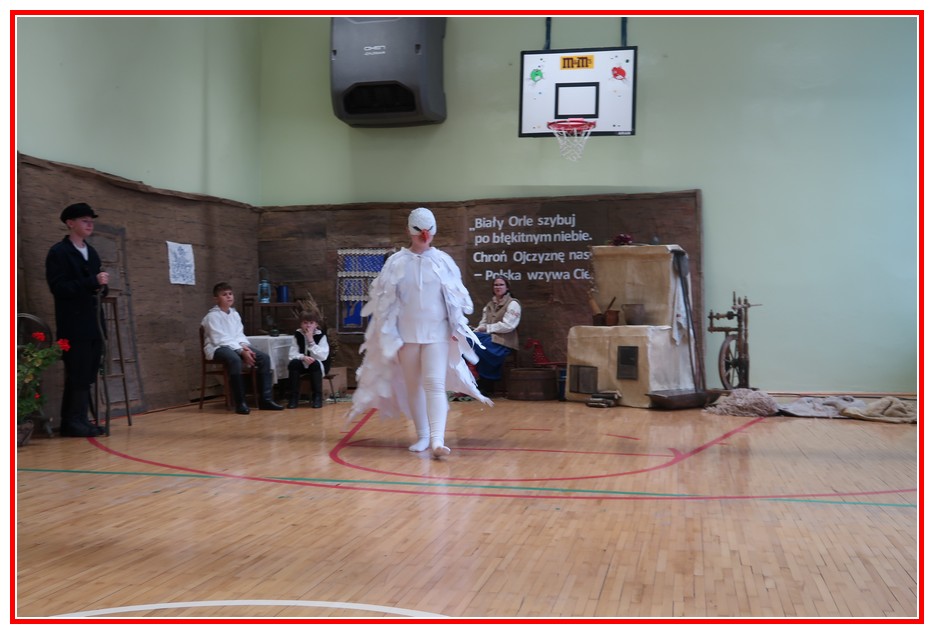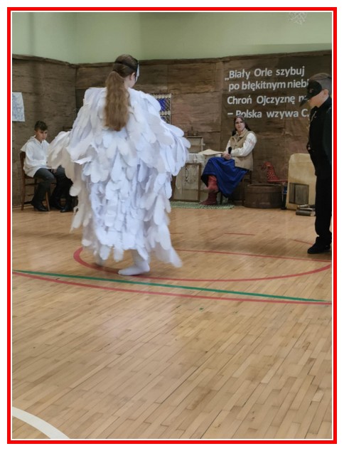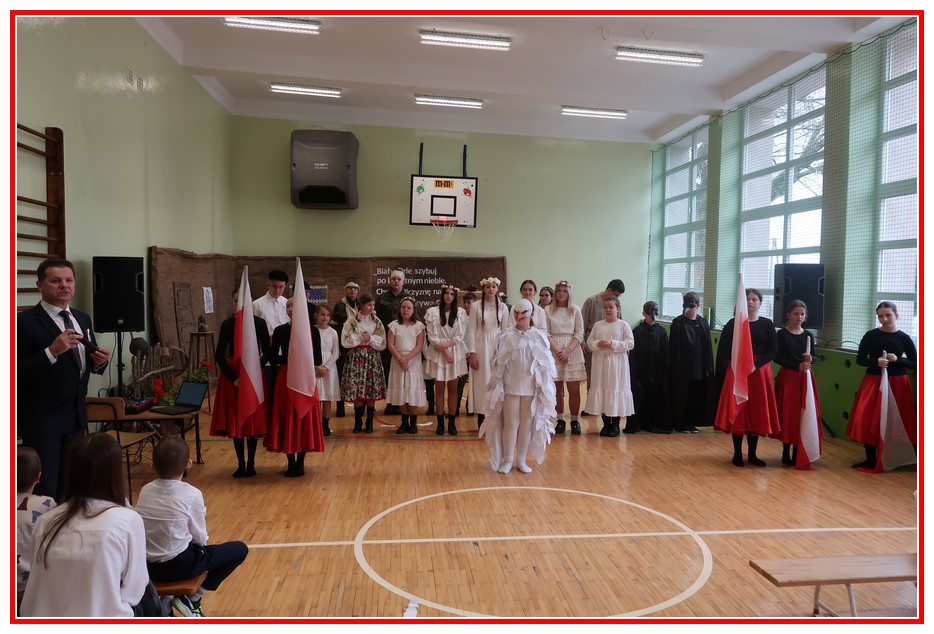 Z okazji rocznicy odzyskania Niepodległości przez Polskę, uczniowie zaprezentowali spektakl teatralny pt.”Pisk białego Orła”. Fabuła przedstawienia osnuta została wokół losów wiejskiej rodziny, która w czasie I wojny światowej przeżyła wojenną traumę – wymarsz ojca i jednego z synów na front. Ludzie ci ukrywali w swoim domu poetę, który odwołując się do literatury i poezji okresu zaborów, podtrzymywał i umacniał głęboki patriotyzm domowników. W wielu sytuacjach odwoływał się do tragicznej historii naszego państwa. Symbolem wolnej Polski staje się biały orzeł, którego pisk, słyszalny w duszy Polaków, nie pozwalał tracić nadziei na wolność. Jednak oprócz prawdziwych patriotów byli i tacy, którym było obojętne, czy Polska jest wolna, czy nie, „byle był spokój i miska pełna”. Taką postawę reprezentowały koty. Spektakl został urozmaicony pantomimą ukazującą Legendę o Białym Orle. Była to w nietypowy sposób opowiedziana historia utraty i odzyskania niepodległości przez naszą Ojczyznę. Sam moment zmartwychwstania Polski został przedstawiony w formie układu tanecznego z flagami. Przedstawienie odbywało się przy nastrojowych, dobranych do tematyki patriotycznej piosenkach, wykonanych przez szkolny zespół wokalny. Myślą przewodnią całości były słowa z pieśni Szybuj Orle: „Biały Orle szybuj po błękitnym niebie . Chroń Ojczyznę naszą- Polska wzywa Ciebie”