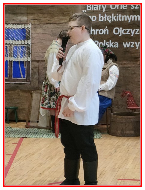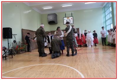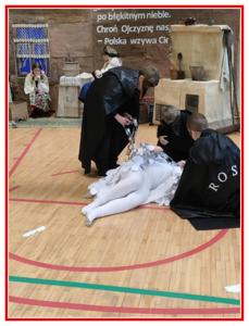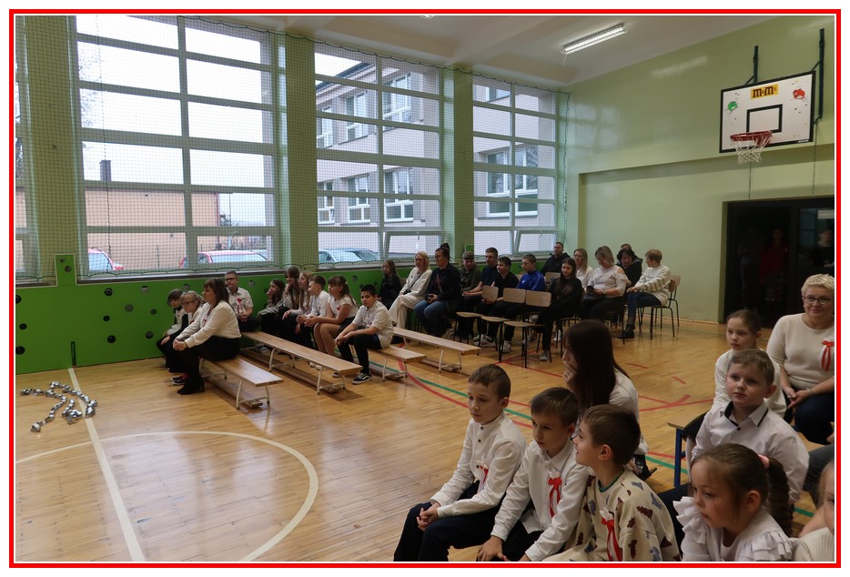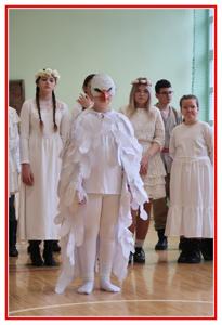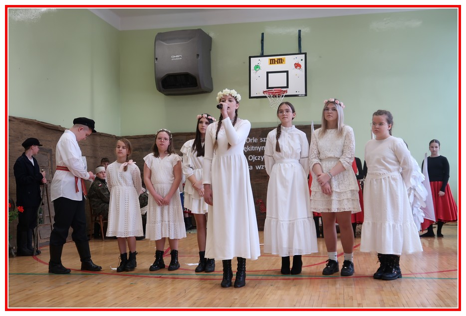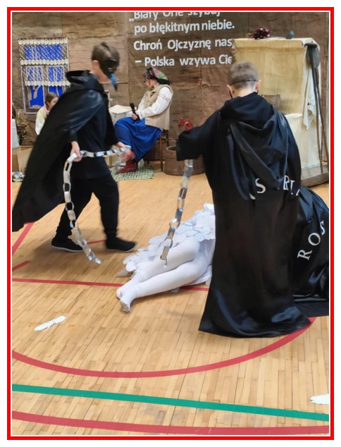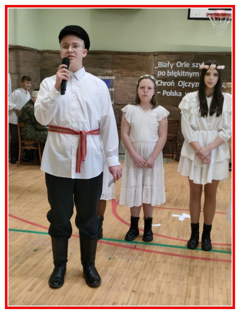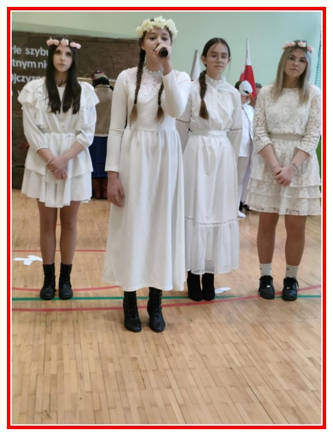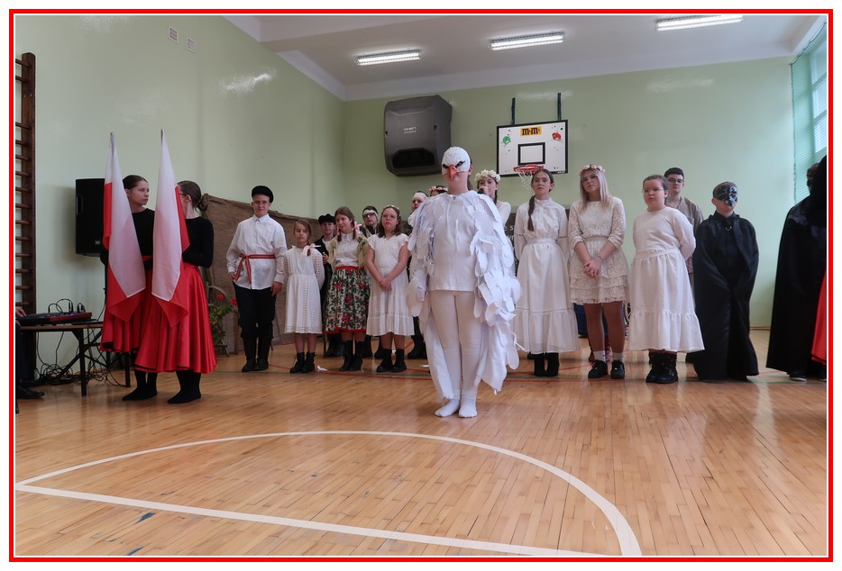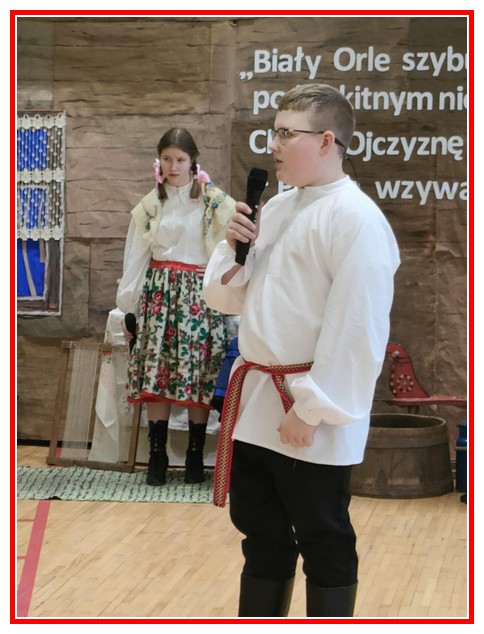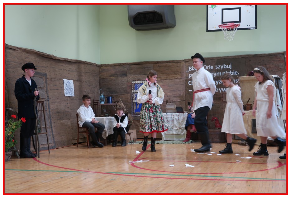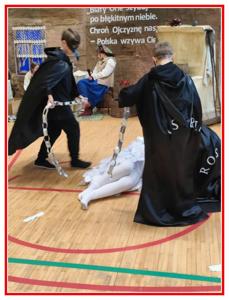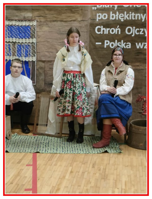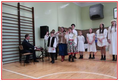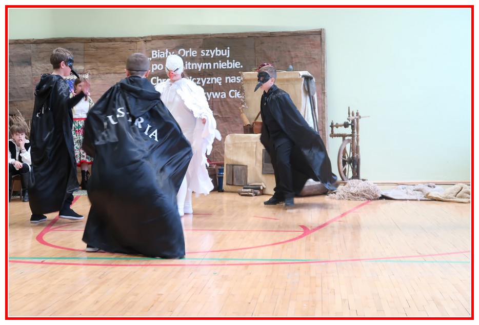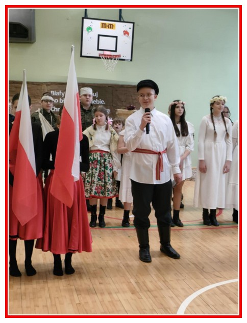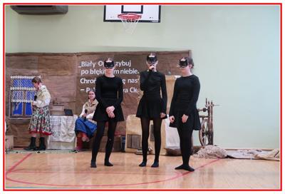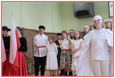 Z okazji rocznicy odzyskania Niepodległości przez Polskę, uczniowie zaprezentowali spektakl teatralny pt.”Pisk białego Orła”. Fabuła przedstawienia osnuta została wokół losów wiejskiej rodziny, która w czasie I wojny światowej przeżyła wojenną traumę – wymarsz ojca i jednego z synów na front. Ludzie ci ukrywali w swoim domu poetę, który odwołując się do literatury i poezji okresu zaborów, podtrzymywał i umacniał głęboki patriotyzm domowników. W wielu sytuacjach odwoływał się do tragicznej historii naszego państwa. Symbolem wolnej Polski staje się biały orzeł, którego pisk, słyszalny w duszy Polaków, nie pozwalał tracić nadziei na wolność. Jednak oprócz prawdziwych patriotów byli i tacy, którym było obojętne, czy Polska jest wolna, czy nie, „byle był spokój i miska pełna”. Taką postawę reprezentowały koty. Spektakl został urozmaicony pantomimą ukazującą Legendę o Białym Orle. Była to w nietypowy sposób opowiedziana historia utraty i odzyskania niepodległości przez naszą Ojczyznę. Sam moment zmartwychwstania Polski został przedstawiony w formie układu tanecznego z flagami. Przedstawienie odbywało się przy nastrojowych, dobranych do tematyki patriotycznej piosenkach, wykonanych przez szkolny zespół wokalny. Myślą przewodnią całości były słowa z pieśni Szybuj Orle: „Biały Orle szybuj po błękitnym niebie . Chroń Ojczyznę naszą- Polska wzywa Ciebie”