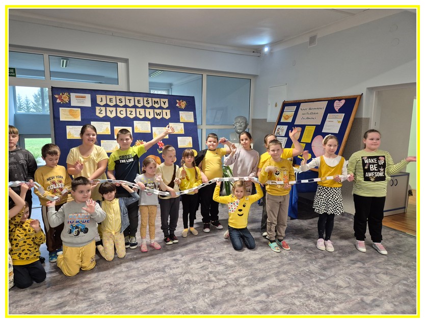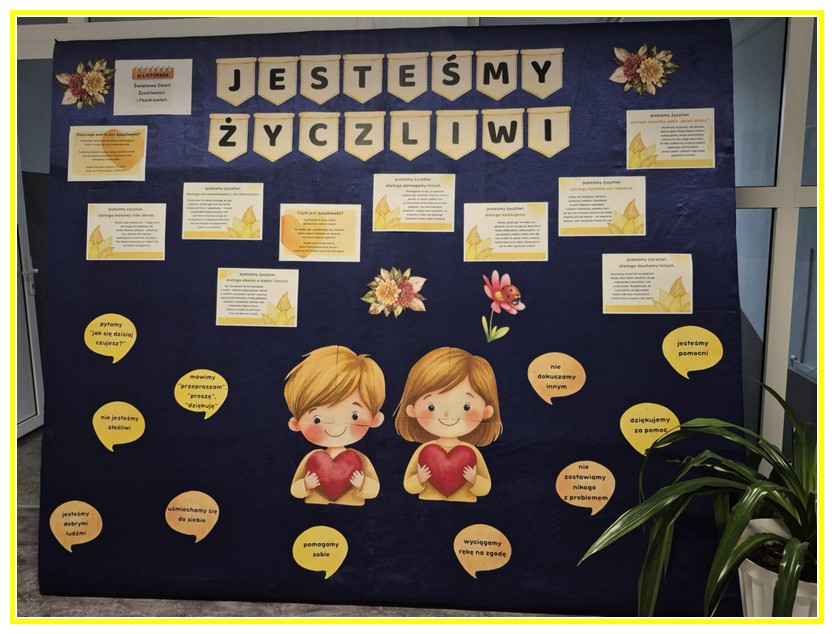 Dnia 20 listopada 2025r. w naszej szkole obchodzony był Światowy Dzień Życzliwości i Pozdrowień, który obchodzony jest 21 listopada na całym świecie. Jest to międzynarodowe święto promujące uprzejmość, dobre słowa i pozytywne gesty, mające na celu budowanie lepszych relacji międzyludzkich. Celem tego dnia było uwrażliwianie uczniów na wzajemną życzliwość, promowanie pozytywnych emocji i dobrych uczynków na co dzień.