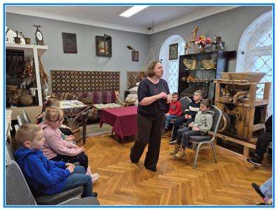 Po części warsztatowej udaliśmy się na spacer po muzeum, podczas którego obejrzeliśmy aktualną wystawę etnograficzną oraz liczne eksponaty związane z regionem hrubieszowskim.