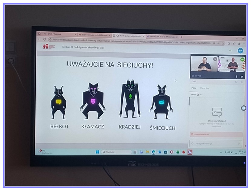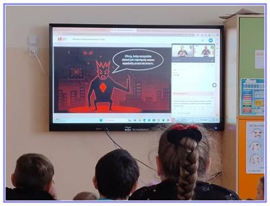 Udział w webinarze wzięli uczniowie klas 0, I, II, III.Celem lekcji było rozwijanie umiejętności świadomego korzystania z Internetu. Uczniowie poznali przykłady treści nieodpowiednich lub szkodliwych, dowiedzieli się, jak mogą wpływać na emocje i co zrobić, gdy się na nie natkną. Rozmawiano także o tym, gdzie szukać wartościowych i pozytywnych materiałów online.