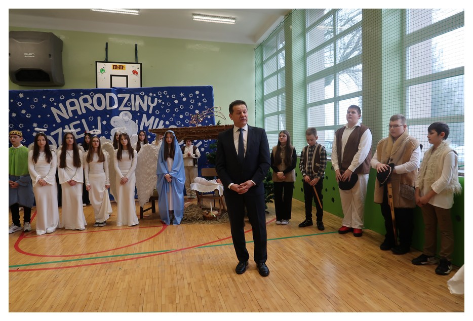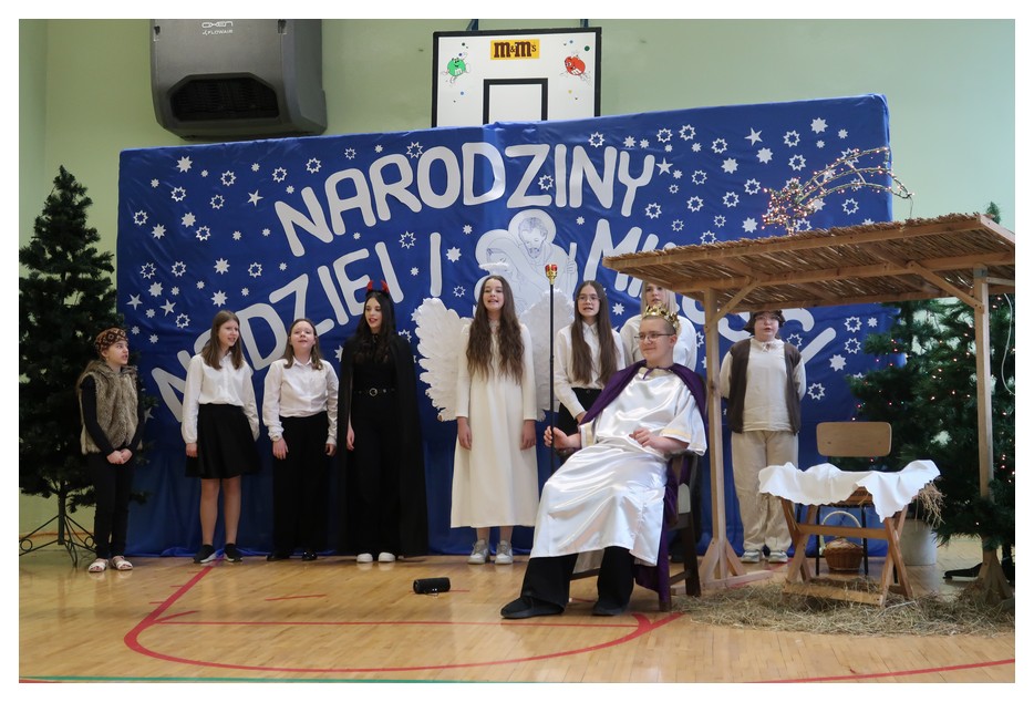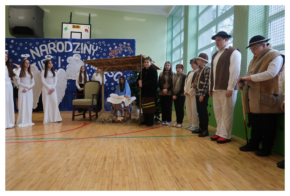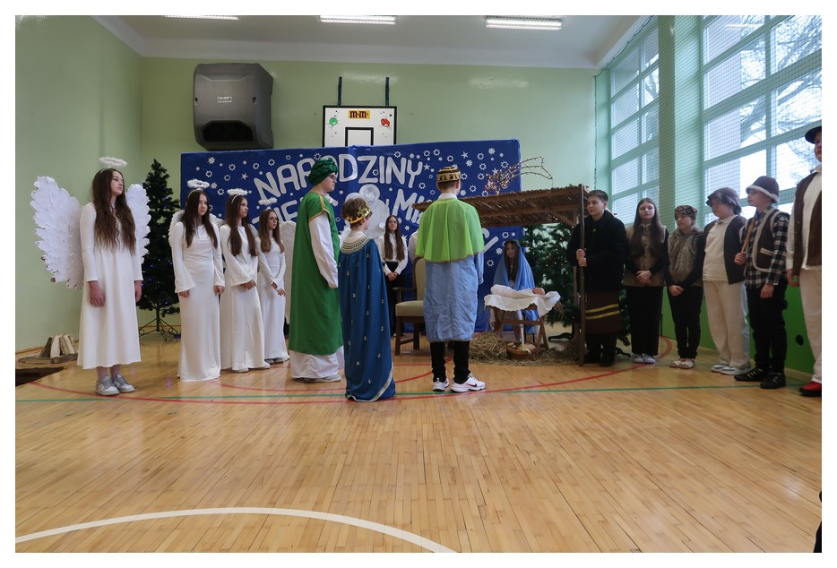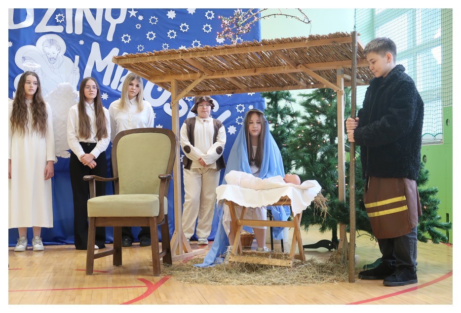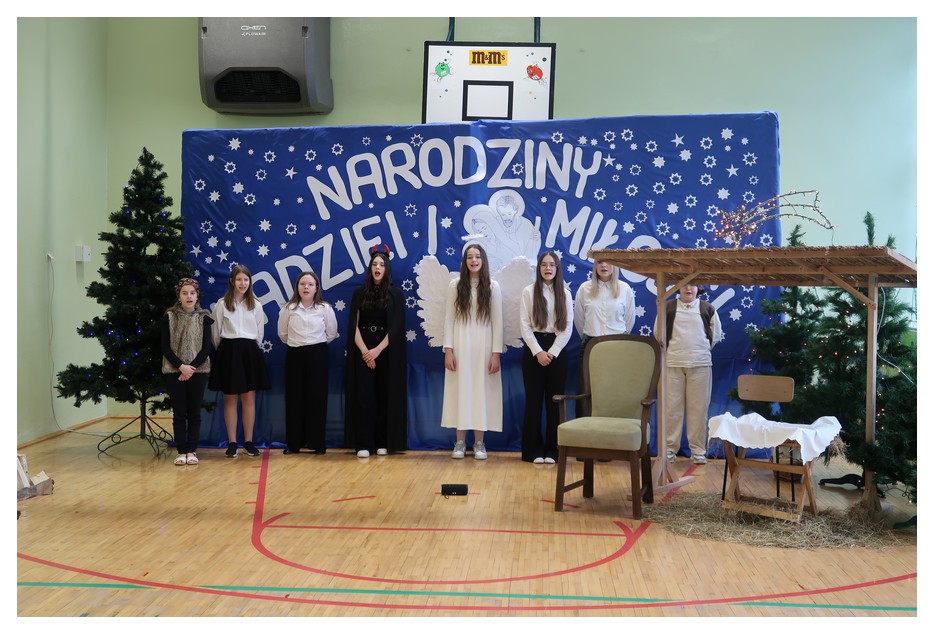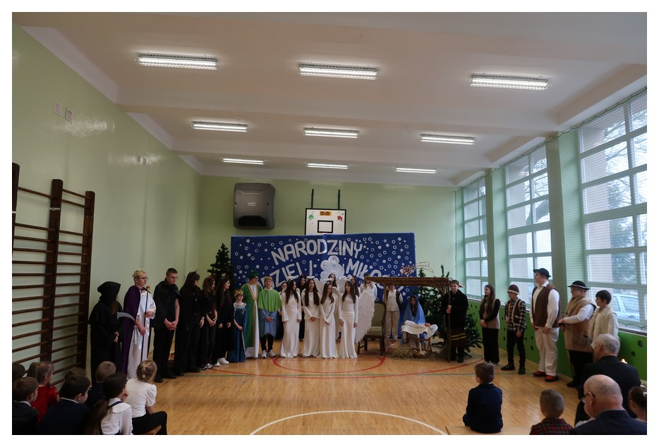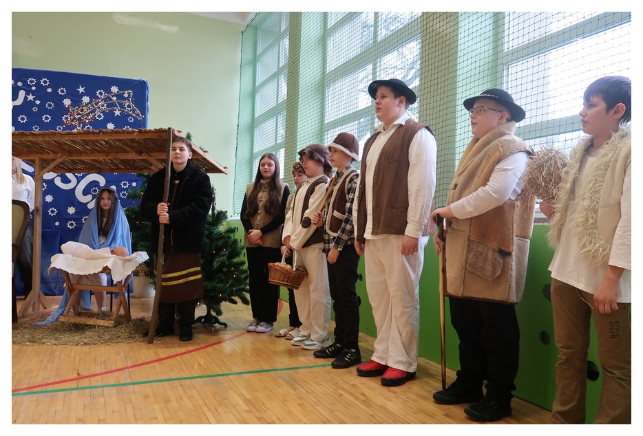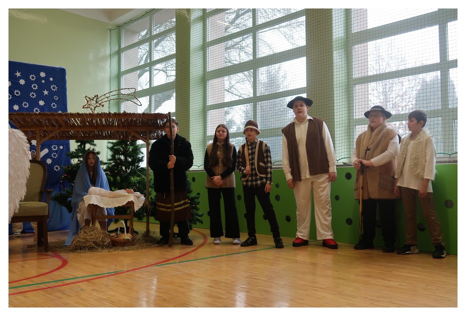W piątek 19 grudnia w naszej szkole odbyły się tradycyjne jasełka, które wprowadziły całą społeczność szkolną w radosny i podniosły nastrój zbliżających się Świąt Bożego Narodzenia. Uroczystą akademię świąteczną przygotował Pan Mieczysław Ostaszewski wraz z uczniami klas IV–VIII. Wyjątkowy, świąteczny klimat uroczystości podkreśliła także piękna dekoracja, przygotowana przez Panią Wiesławę Martyniuk, która nadała szkolnej przestrzeni ciepły, bożonarodzeniowy charakter. Całość wydarzenia uświetnił piękny śpiew wspaniałych polskich kolęd i pastorałek w wykonaniu szkolnego zespołu wokalnego, prowadzonego przez Pana Dyrektora Andrzeja Pachlę. Występ dostarczył wielu wzruszeń i został nagrodzony gromkimi brawami.