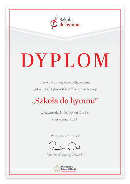10.11.2022 Aktualności Szkoła do hymnu Już po raz piąty cała Nasza społeczność szkolna wzięła udział w akcji "Szkoła do hymnu". W ostatni dzień roboczy przed Narodowym Świętem Niepodległości o symbolicznej godzinie 11:11 zaśpiewaliśmy „Mazurka... Czytaj więcej