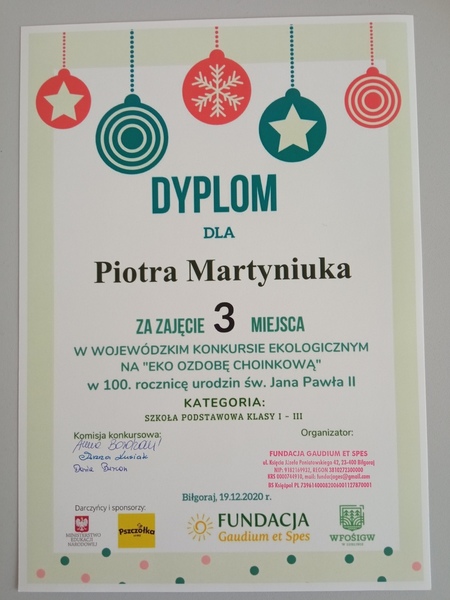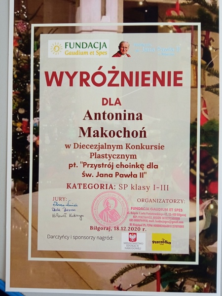 27.01.2021 Aktualności "PRZYSTRÓJ CHOINKĘ DLA ŚW. JANA PAWŁA II" W grudniu 2020 r. pomimo trudnej sytuacji i nauczania zdalnego uczniowie naszej szkoły pod kierunkiem p. E. Lebiedowicz oraz swoich rodziców wzięli udział w Diecezjalnym... Czytaj więcej